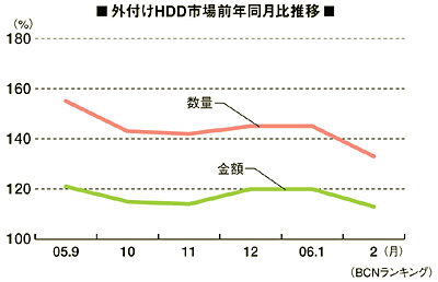 外付けHDD市場が前年を大きく上回る堅調な伸びを維持している。図はBCNランキング月次データによる販売台数および販売金額を前年同月対比で示した。今年2月に伸び率が若干鈍化したものの、販売台数は前年比130-150%を保っている。