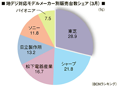 図は、BCNランキングによる3月の地デジ対応モデルのみを抽出し、メーカー別販売台数シェアを示した。この結果、首位は東芝でシェアは28.9%、2位はシャープ(21.8%)、3位は松下電器産業(16.7%)であった。東芝は昨年12月の時点では3位にとどまっていたが、今年1月にトップシェアを奪取、それ以降首位の座をキープする。一方、12月に首位だった松下は、3月には3位へとダウンした。そのほか、12月に4位だったシャープが3月には2位に上昇するなど、激戦となっている。