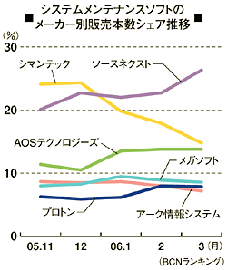 2004年までシマンテックが首位の座を堅持してきたが、05年通年では僅差でソースネクストがトップシェアを奪取。今年に入ってからさらに勢いを加速させ、3月には2位のシマンテックとの差を大きく広げた。シマンテックは3位のAOSテクノロジーズと2位の座を争う状況だ。