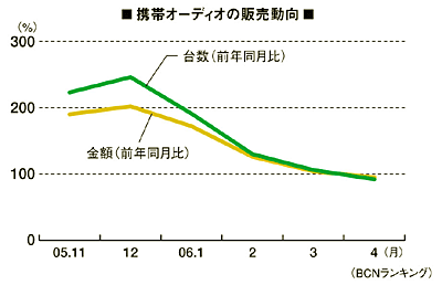 携帯オーディオ市場が冷え込みはじめている。図は、同市場の前年同月比推移を表したもの。今年に入ってからは、これまでの爆発的な勢いは鈍り、3月の販売台数は前年同月比106%、販売金額は104%と低い伸びにとどまった。減速感は4月に入ると鮮明化しており、台数は92%、金額は95%とはじめてマイナスへと転じた。