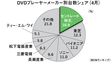 セントレードM.E.は、2005年のDVDプレーヤー市場でBCNランキングの首位を獲得。今年に入ってからもトップを維持している。4月の機種別シェアでも「ADS-300V」が首位。同製品は据え置き型のDVDプレーヤーで、平均実売価格は4320円。2位のパイオニア「DV-484」(7429円)と比較すると圧倒的に低価格だ。ポータブルタイプのみでデータを見ても、セントレードM.E.「JPT-700W」が(1万4771円)首位。2位の長瀬産業「AXN4709TN-WH」(2万4384円)と比較すると、やはり圧倒的に低価格だ。