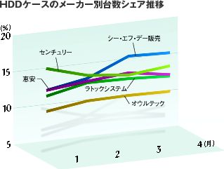 HDDケース市場における4月のメーカー別販売台数は、シー・エフ・デー販売が首位で16.3%。2位はセンチュリー14.5%、3位は恵安13.3%で、熾烈なシェア争いが続いている。一方、販売金額では、センチュリー(27.2%)が、2位のシー・エフ・デー販売(16.4%)を10.8ポイント引き離してトップに立っている。製品別では、センチュリー「CSL35U2 外付け3.5インチ用HDケース」が首位で、平均実売価格3769円。上位にランクインしている製品は、1000-2000円前後の安価な製品が多い。そのため、販売金額トータルでセンチュリーが、首位を獲得する要因となった。
