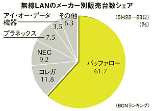 無線LANの店頭販売は、バッファローが圧倒的なシェアでトップを維持している。5月22-28日のメーカー別販売台数シェアで61.7%を獲得した。機種別シェアでは、上位10機種のうち9機種を同社の製品が占めている。ここ数年、同社が首位に君臨しており、無線LAN市場は当面、1強時代が続きそうだ。