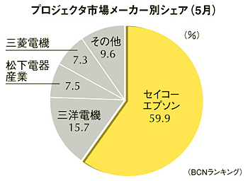 プロジェクタ市場は、セイコーエプソンがメーカー別シェア50%以上を獲得し、トップを維持している。5月の製品別シェアでは、エプソンのDVDプレーヤー一体型でスクリーンがセットになっている「EMP-TWD1SP dreamio」(平均実売価格12万6798円)が首位。1-3位までエプソンの製品が占めており、その1-3位の販売台数シェアトータルは46.4%。圧倒的に優位に立っている。