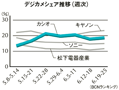 BCNランキングでシェア推移を見ると、カシオの場合、同機発売前のメーカー別シェアは13─15%だったが、現在は20%前後でキヤノンとトップ争いを演じている。
