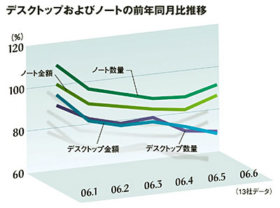 DVDレコーダーが、今年5-6月に前年同月比プラスに転じ、ワールドカップ特需の恩恵を受けたが、パソコンについては、特需効果は現れていない。また、次期ウィンドウズOSのビスタが来年に延期となったため、年末商戦での需要低下は否めないと業界筋ではみている。しかし、今年4月から来年3月の年度でみると、年明けに待望のビスタ搭載パソコンが投入されることで、低調な動きを挽回できるとの期待が大きい。