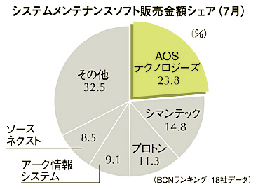 AOSテクノロジーズは、システムメンテナンスソフト市場の販売金額シェアで今年5月に首位を獲得。シマンテックと順位が入れ替わり、現在も首位の座を維持している。図は、BCNランキングによる今年7月の同市場のシェアを表したもの。2位のシマンテック(14.8%)とは9ポイントの差をつけている。