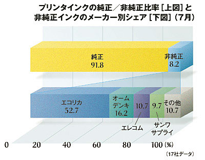 プリンタインクの7月時点でのメーカー別シェアは、首位がキヤノンで45.5%、2位はセイコーエプソン37.2%、3位が日本ヒューレット・パッカード(日本HP)4.5%、4位がエコリカ4.3%となっており、キヤノンとエプソンの合計シェアで80%を超えている。製品別シェアの上位を占めているのは、キヤノン、エプソンのインクジェットプリンタ用の純正品。首位は、キヤノンのブラック単品「BCI-3EBK」、2位はエプソンの5色+ブラック「IC6CL32」。上位10製品のうち8製品がキヤノンのインクとなっている。