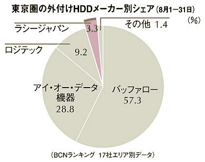 外付けHDD市場は、バッファローとアイ・オー・データ機器の上位2社でシェア85%以上(台数ベース)の「2強体制」が築かれている。BCNランキングによれば、8月単月(8月1-31日)の上位7機種は、両社の160-300GB(1万-1万5000円)の製品で占められている。
