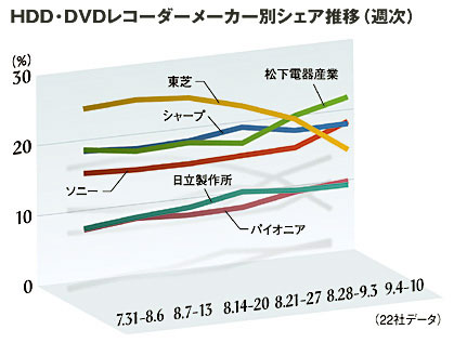 HDD・DVDレコーダー市場は、図のメーカー別台数シェアが示すとおり、これまで3位で推移していた松下電器産業が、8月28日-9月3日の週に東芝を抜きトップシェアに躍進してきた。直近の9月4-10日のシェアは、首位の松下が21.7%、2位ソニー(18.3%)、3位シャープ(17.9%)、4位東芝(14.2%)の順。トップを維持してきた東芝は、9月に入って減速感が目立ちはじめている。