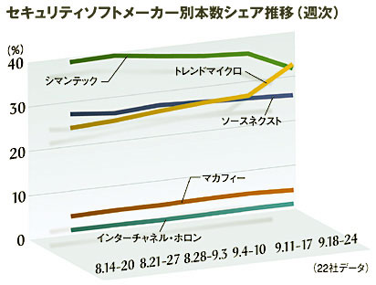 一方、今まで2位以下に10ポイントの差をつけていたシマンテックは徐々にシェアを落とし、首位から転落した。しかし、製品別では「ノートン・インターネットセキュリティ2006」が安定した売れ行きを示し、1位をキープ。また9月30日に、「ノートン・アンチウイルス2007」「ノートン・インターネットセキュリティ2007」を発売済みで、各社のシェアが大きく変動することが予想される。