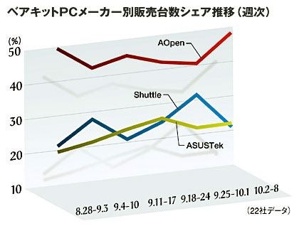 ベアキットPCの販売動向は10月2-8日の週次でAOpen(エーオープン)が台数シェア48.3%を獲得、ASUSTek(アサステック)の22.1%、Shuttle(シャトル)の21.0%を大きく引き離して独走。昨年の8月以降、トップシェアを維持する展開だ。昨年、市場はやや鈍化していたが、シェア上位勢のアサステックとシャトルは躍進していた。今年も市場は勢いが鈍ったままで、9月の販売台数は前年同期比65%にとどまった。