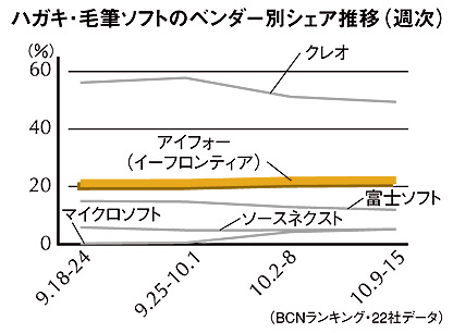 年賀状作成ソフトは、9月から各社が順次新製品の販売を開始し、年末にかけて商戦が本格化する。昨年12月のBCNランキングによると、市場全体の販売本数は、10月(昨年)の約4.9倍。同市場は、需要が頂点に達する12月が勝負となる。10月現在のシェア争いでは、まだ勝敗は見通せないが、激戦が繰り広げられるのは間違いない。