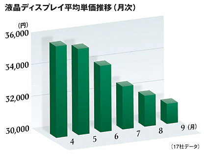 BCNランキングによれば、液晶ディスプレイの平均単価は2004年の5万円台から今年4月には3万5000円台になり、さらに9月には3万1000円台と安値を更新した。安い価格帯のものは1万3000円台で販売されている。一方、デルは直販サイトで24インチ液晶ディスプレイをキャンペーン価格6万9000円と破格の値段で売り出している。全体的に、消費者が購入しやすい価格まで値下がってきた。BCNランキング10月16-22日の週次データでは、ベンダー別販売台数シェアで、三菱電機が29.1%で1位、ついで2位のアイ・オー・データ機器が14.3%、3位がバッファローで10.8%。三菱はビジネスユース向けがよく売れており、頭一つ出ている状態だ。