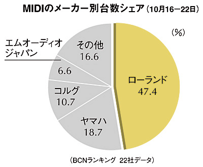 ローランドは、BCNランキング直近週次データ(10月16-22日)の「MIDI部門」で、台数で47.4%、金額では39.8%を獲得する。2位ヤマハ、3位コルグに圧倒的差をつける。製品別上位10製品のなかでは、ローランド製品の6モデルがランクインしている。6年連続トップシェアを獲得する強さは、今年も変わりはない。