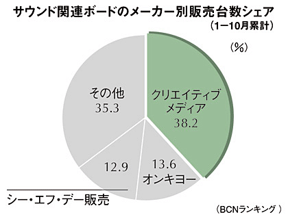 図はBCNランキング「サウンド関連ボード」の今年1月から10月末までの販売台数をもとに、メーカー別台数シェアを示した。クリエイティブメディアのシェアは38.2%でトップ。2位のオンキヨーに24.6ポイントの差をつける。年間の販売台数でトップシェアを獲る可能性が高い。実現すれば、サウンド関連ボード部門がマルチメディア部門だった2000年から7年連続のトップになる。