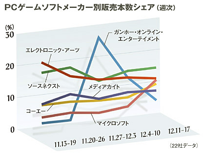 PCゲームソフトの市場は、各社入り乱れる混戦となっている。12月11-17日のBCNランキングでメーカー別シェアをみると、ソースネクストが14.4%をとり、1位を維持している。エレクトロニック・アーツが11.0%で2位、マイクロソフトが10.5%で3位の順となっている。タイトル別では、ランキングの入れ替わりが激しい。昨年12月にリリースされたばかりのマイクロソフト「Age of Empires 3 ザ ウォーチーフ 日本語版」が7.6%のシェアを獲得し1位。2位には4.2%でコーエーの「信長の野望 Online -破天の章-」がランクインした。3位は2.1%で昨年4月に発売したスクウェア・エニックスの人気シリーズ「ファイナルファンタジーXI オールインワンパック2006」が入っている。