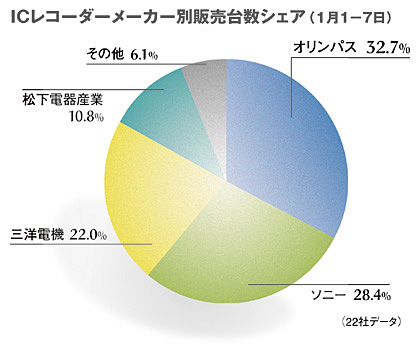 2006年12月のICレコーダー市場は、販売台数が前年同月比で62%増、金額で46%増と好調に推移している。1月1-7日のベンダー別販売台数シェアではオリンパスが32.7%のシェアを獲得し1位、ソニーが28.4%で2位。3位以降は、三洋電機が22.0%、松下電器産業が10.8%の順。