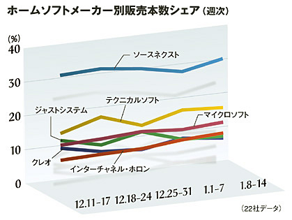 12月のホームソフト市場は、販売本数が前年同月比13%増と好調だが、金額ベースでは15%減と、単価下落が顕著に現れている。ホームソフトには、家計簿や株式投資など多種多様のアイテムが含まれており、単価が低いものがよく売れたようだ。1月8-14日のベンダー別販売本数シェアではソースネクストが30.1%のシェアを獲得し、他のベンダーに大きく差をつけている。2位のテクニカルソフトは15.7%、3位は11.3%でマイクロソフトと続く。2位以下はシェアに大きな開きはなく、混戦となっている。