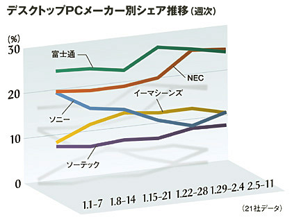 デスクトップPCの1月の市場は、台数が前年同月比で28.2%減、金額は31.1%減で推移している。引き続き、前年比では低調なものの、昨年11月に記録した34.8%減に比べ、徐々にマイナス幅は減少傾向にある。メーカー別では、首位を続けていた富士通を2月5-11日の週でわずかに抜いたNECが24.7%のシェアを取り、僅差で首位。2位は富士通(24.2%)、3位はソニー(10.8%)の順となっている。ソニーは1月1日時点に比べ、9ポイント近くシェアを落とす結果となった。