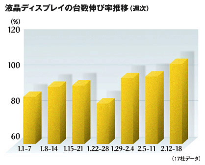 液晶ディスプレイが回復の兆しを示しつつある。1月の販売台数は、前年同月比で87.0%、金額は77.9%と、いずれも2ケタ減にとどまった。ただ週次ベースでみていくと、年明けは2ケタのマイナスとなったが、その後は徐々に回復、2月12-18日の週次では台数が4.7%増とプラスに転じていることから、春商戦でもこの勢いを持続する可能性は高い。2月12-18日のベンダー別台数シェアは、三菱電機が19.5%でトップ。以下はアイ・オー・データ機器(18.2%)、ベンキュージャパン(10.3%)が上位陣を形成する。年明け以降、2位以下にランクしているメーカーの躍進ぶりが顕著に現れてきた半面、トップの座を維持し続ける三菱のシェアが徐々に下降傾向にある。