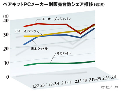 2月のベアキットPC市場は、前年同月に比べて伸び悩んでいる。メーカー別ではエーオープンジャパンがシェア低下に転じる一方、アスース・テックが好調で、昨年10月には20ポイントもの差があった1位と2位の差が縮まり、競り合う形となっている。2月26日-3月4日のメーカー別販売台数シェアではエーオープンが30.6%で1位。しばらく1位を維持していたエーオープンは2月19-25日の週では、アスース・テックにトップの座を譲り渡したが、再び1位に返り咲いた。わずか1.4ポイントの差でアスース・テック(29.2%)が2位、3位は日本シャトル(27.5%)の順。上位3社で80%以上を占める寡占市場となっている。