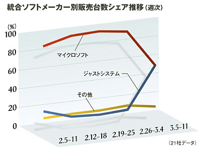 新スイートの発売直後だけに、統合ソフトでジャストシステムが好調な出足をみせている。「JUST Suite 2007」は当初、2月9日に発売を予定していたが、3月9日に延期になった。当初発売が予定されていた2月9日を含む2月5-11日の週では、予約販売によって販売本数別メーカーシェアは12.4%を獲得したが、その後は伸びきれず、わずか1-3%台にとどまっていた。ところが、本格販売がスタートした3月5-11日の週では、48.6%を獲得して急伸、マイクロソフト(47.7%)を抜いて一気にトップシェアを獲得した。