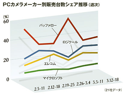 最新週の機種別販売台数シェアでは、バッファローのCMOS 35万画素 WEBカメラヘッドセット付モデル「BWC-35H01」のシルバーが8.5%で1位。2位もバッファローで同一機種のブラック(5.1%)がランクインした。さらに3位もバッファローのCMOS 130万画素 WEBカメラヘッドセット付「BWC-130H01」が入り、1から3位までをバッファロー製品が独占した。