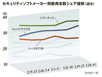 3月26日-4月1日のセキュリティソフトメーカー別販売本数シェアは、シマンテックが32.4%で1位、トレンドマイクロが29.3%で2位、ソースネクストが21.5%で3位の順。かつては首位シマンテックと2位との間に10ポイント以上もの開きがあったが、ここへきて差が縮まっている。同週の機種別販売本数シェアは、トレンドマイクロ「ウイルスバスター2007 トレンド フレックス セキュリティ 優待 1年版 Vista対応」が16.9%で1位。シマンテック「ノートン インターネットセキュリティ 2007 (WindowsVista対応)」が16.1%で2位、ソースネクスト「ウイルスセキュリティZERO」が14.3%で3位となっている。4月4日にはトレンドマイクロに引き続き、ソースネクストが同社製品で「Certified for Windows Vista」ロゴを取得したと発表した。トレンドマイクロは同ロゴを先行取得したことが奏功したか、好調な売れ行きだ。新たにソースネクストがロゴを取得したことで上位3社のシェアがどのように変動するか、注目したい。