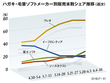 ハガキ・毛筆ソフトは、暑中見舞いに備えて、夏バーションの新製品が市場を賑わせている。6月4-10日のBCNランキングメーカー別販売本数シェアはクレオが63.1%で1位、富士ソフトが14.5%で2位、ソースネクストが7.9%で3位の順。