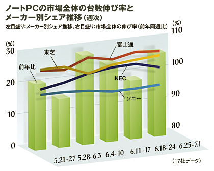 ノートPCの週次ランキングで、ここ数週間は富士通が東芝を上回りトップシェアを維持する。ノートPC市場は従来から東芝、NEC、富士通の三つ巴状態が続いている。市場の伸び率は前年同週比でみると、95%から108%の間で推移しており、堅調な売れ行きといえる。6月25日-7月1日のメーカー別販売台数シェアでは、富士通がトップで2位は東芝、3位はNECの順。この上位3社は20%前後の台数シェアを維持している。3社に続くのはソニーとなるが、ここ数週間はやや精彩を欠く。