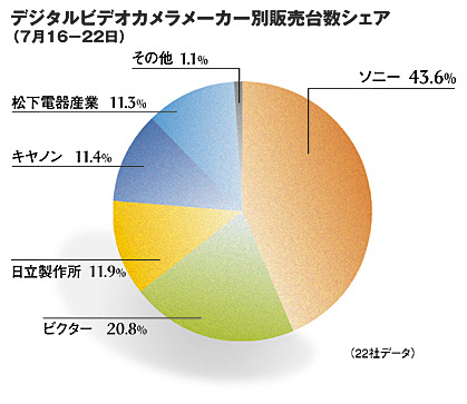 デジタルビデオカメラの市場は、ソニーが競合他社に差をつけて1位を維持している。7月16-22日のBCNランキングでは、ソニーが43.6%と、ほぼ、半数近いシェアを獲得してトップ。続く2位は、ビクター(20.8%)、3位が、日立製作所(11.9%)の展開となっている。