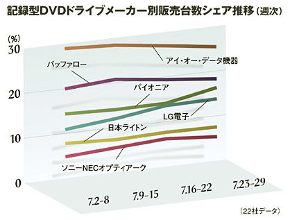 PC周辺機器が軒並みプラス成長しており、記録型DVDドライブも好調な伸びを示している。7月23-29日の記録型DVDドライブのメーカー別販売台数シェアは、1位がアイ・オー・データ機器(25.4%)、2位がバッファロー(18.2%)、3位がパイオニア(16.2%)となっている。パイオニアとLG電子のシェアが徐々に上がってきている。