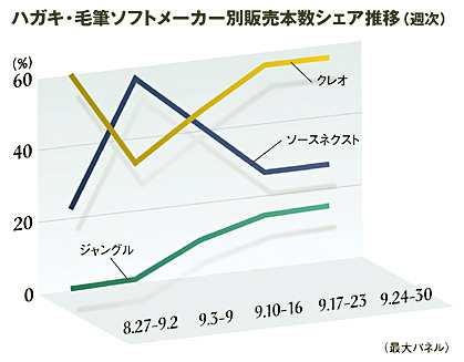 ハガキ・毛筆ソフト市場では、ランキングに変動があった。これまで長い間、1位を堅持してきたクレオのシェアを、9月3-9日の1週のみだがソースネクストが抜き、トップに躍り出た。ハガキソフトでは今年、クレオ以外の上位2社の版権譲渡が行われ、富士ソフトの「筆ぐるめ」をジャングルが、イーフロンティアの「筆王」をソースネクストが販売するようになった。特にソースネクストでは、セキュリティZEROで成功した、更新料を無償にする「ZERO戦略」を「筆王」にも適用。奏功した格好となった。9月24-30日のBCNランキングメーカー別販売本数シェアでは、クレオが56.5%で1位。2位はソースネクスト(26.8%)、3位はジャングル(15.3%)の順。