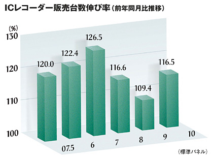 ICレコーダー市場が拡大傾向を示している。BCNランキングによると、今年に入ってからは台数、金額ともに連続して前年同月実績を上回る勢いで、需要は増大基調にある。10月の販売台数は16.5%増と2ケタの伸びを示した。メーカー別販売台数シェアでは、強みを発揮するオリンパスが44.1%でトップの座を維持する。オリンパスに続くのはソニー(29.6%)、三洋電機(16.5%)の順で、上位3社で市場のほぼ9割を占有。寡占化が顕著に現れている。