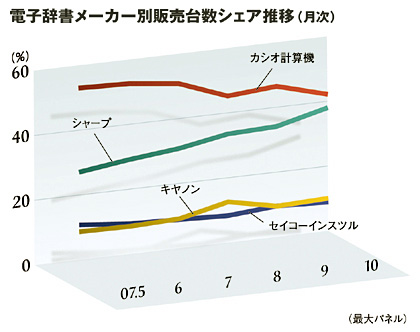 電子辞書市場の主導権争いが、一段と激しさを増している。BCNランキングによると、メーカー別販売台数シェアでカシオ計算機がトップの座を維持するが、ここ数か月はシャープが猛追、今年5月に23.0ポイントあった両社の差が10月ではわずか4.5ポイントにまで縮まってきた。10月の機種別販売台数シェアでは、今年5月に発売されたシャープPapyrusシルバー「PW-AT760-S」が7.0%でトップ。2位は2003年に販売がスタートしたシャープの電子辞書「PW-M800」(5.5%)、3位は今年8月に売り出したカシオEX-wordシャンパンゴールド「XD-SW6500」(5.3%)、4位は同じくカシオEX-wordシルバー「XD-SW4850」(4.7%)の順。