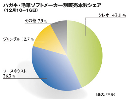ハガキ・毛筆ソフトの市場では、ソースネクストが大躍進を遂げている。BCNランキングによると、12月10-16日のハガキ・毛筆ソフトメーカー別販売本数シェアは、1位がクレオ(43.1%)、2位がソースネクスト(36.3%)、3位はジャングル(12.7%)となっている。ソースネクストの戦略である「更新料0円」や、CD、DVDを同梱しているため、買い求める際にわずらわしくないのが消費者の目を引いているようで、1位のクレオとの差が30ポイント以上もあった半年前と比べ、現在は6.8ポイントにまで縮まっている状況だ。