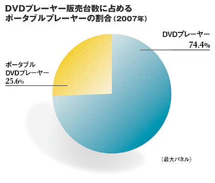 昨年1年間のDVDプレーヤー全体の販売台数実績のうち、ポータブルDVDプレーヤーの占める割合は、25.6%。2006年には全体のうちポータブルは21.4%ほどだった。徐々にではあるが、シェアを伸ばしている状況だ。2007年のポータブルDVDプレーヤーのメーカー別販売台数シェアはセントレードM.E.が17.3%でトップ、2位はソニー16.8%、3位は東芝15.4%の順。