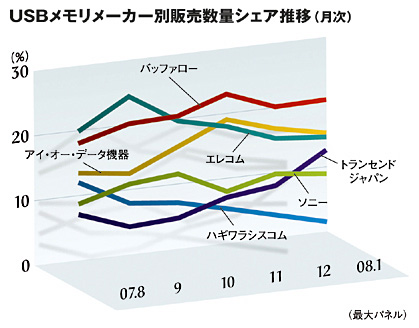 BCNランキングの1月度集計をみると、USBメモリのメーカー別販売数量シェアでは、バッファローが20.3%で1位につけ、2位はアイ・オー・データ機器15.2%、3位はエレコム14.5%の順となっている。同月の機種別販売数量シェアでは、1位がソニーのPOCKET BIT 1GB「USM1GJ」(3.8%)、続く2位がシリコンパワージャパンのUltima II I 1GB「SP001GBUF2M01V1K」(3.4%)、3位はトランセンドジャパンのJetFlash V35 1GB「TS1GJFV35」(2.9%)の順となっている。