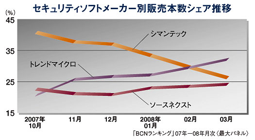 99年以降9年連続で年間の販売本数トップを獲得し続けているシマンテックが、1か月とはいえ1位の座を明け渡した衝撃は大きい。しかし、同社は昨年秋「ノートン・ファイター」を起用したキャンペーンでシェアを急激に伸ばした実績がある。3月6日に発売した「NORTON 360」では、新たな「ノートン・ファイター」キャンペーンを開始しており、その効果次第ではトップシェア奪還も十分考えられる。そこに、製品別で1位をキープするソースネクストも僅差で接近。セキュリティソフトは、上位3社による三つ巴の様相がますます濃くなってきた。(津江昭宏)