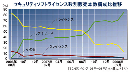 3ライセンス版は他社にも波及した。シマンテックは07年3月の「ノートン360」から、ソースネクストが08年2月の「ウイルスセキュリティ ZERO」から3ライセンス版に絞った展開を始めている。こうした背景から、セキュリティソフトの3ライセンス版は、07年9月に販売本数構成比で5割を突破。直近の08年3月では、8割を超えるまでに拡大した。