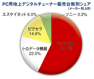 5月のメーカー別販売台数シェアランキングをみてみよう。機種別で1-2位を独占したバッファローが57.2%を獲得して1位。2位はI・Oデータで22.0%。PCIスロット対応の新製品の発売を6月末に控えていることもあり、今後の伸びが期待できそうだ。3位は14.6%でピクセラ。メーカー製PCの内蔵地デジチューナーのOEM供給で約5割のシェアを占めるという同社は、性能や安定性で高い実績をもつ。すでに多くのメーカーPCで実現している2番組同時録画やBDへのムーブに関しても、製品化する技術は開発済みなこともあり、こうした多機能製品をいつ発売するかに注目が集まる。