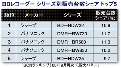 メーカー別のシェア推移をみると、2008年初めはソニーが6割を占めていたが、4月になって低価格機を投入したパナソニックが一気に首位を奪取した。その後、4-6月にはソニーとパナソニック2社のトップ争いが激化。その一方で、シャープが徐々にシェアを拡大してきた。その結果、7-8月は三つ巴の戦いが繰り広げられることになった。そして、次世代DVDの覇権争いやダビング10の運用開始、オリンピック需要などが落ち着きをみせた9月、他社に先駆けて新製品を発売したパナソニックが40.4%でシェア1位を獲得。2位は29.4%でシャープ、3位は28.4%でソニーとなり、パナソニックが一歩リードする展開となった。カラーバリエーションモデルを合算した9月のシリーズ別販売台数シェアでは、1位はシャープの「BD-HDW22」で、シェア15.9%を獲得した。08年7月発売の「AQUOSブルーレイ」シリーズ3モデルのなかで、250GBのHDDを搭載したエントリーモデルにあたる。