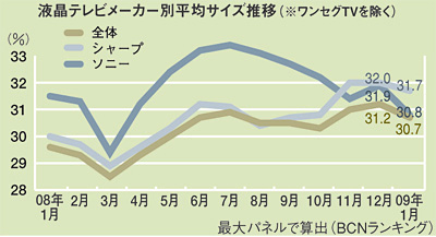 シャープ製の液晶テレビは、今年1月が平均31.7型で前年同期の昨年1月に比べても1.7インチほど大型化。一方、ソニーは昨年7月の33.4型をピークに小型化へ転じ、今年1月の平均画面サイズが30.8型となった。