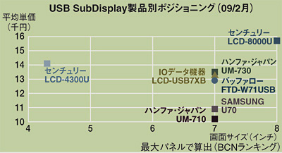 市場を切り開いたのは、コンピュータ・モバイル機器開発製造のセンチュリー。08年10月に進出。これ以降、ハンファ・ジャパンやバッファローなど、現在5社が参入している。平均単価は1万~1万6000円といったところ。一般的な液晶ディスプレイに比べて平均単価が高いのはLED(発光ダイオード)を使っているため。プレゼンでの用途などで受けているようだ。