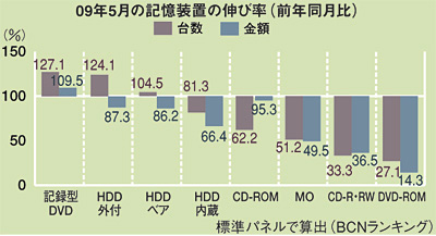 このうち、HDD(外付、内蔵、ベア)やDVD-ROMなど記憶装置は、台数、金額ともに前年同月比を上回ったのが記録型DVDだけだった。DVD-ROMやCD-R・RW、MDなどから、HDDベアなどへの世代交代を示唆する動きとなっている。