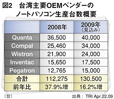 こうした「いけいけどんどん」のムードに冷水を浴びせたのが、世界同時不況だった。台湾のIT業界も成長に急ブレーキがかかり、主要OEMベンダーの2009年の生産台数の伸び率は、前年比で半減する見込み(図2参照)。大手ITベンダーでさえ伸び率が大幅に鈍る状況下では、中小への打撃は避けられず、「09年の受注高は台湾のIT業界全体で前年比2割減」(台湾の大手ITベンダー幹部)とまで危惧されている。