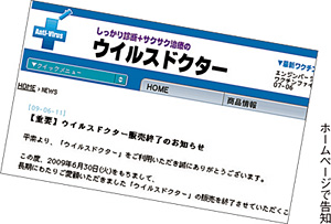 HP上の発表では、「Ver.11」が09年6月30日で販売を終了。継続利用手続きも同日で締め切った。現在の「Ver.11」ユーザーには、使用期限まで不具合対応・ワクチン提供などのサポートを行う。また未使用・未登録の製品は、今年10月30日までにユーザー登録を完了することで、1年間利用できる。サポートサービスの提供の最終期限は、2010年10月29日18時まで。