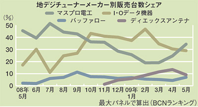 マスプロ電工は09年2月に一時18.9%までシェアを下げたが、5月は34.1%まで回復しトップに返り咲いた。バッファローやディエックスアンテナなどのメーカー製品も徐々にシェアを拡大しており、アナログ放送終了まで市場の活況が続きそうだ。
