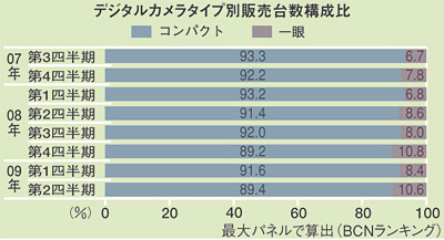 コンパクトと一眼の台数構成比をみると、07年第3四半期の一眼構成比は6.7%。これが09年第2四半期には、10.6%まで比率を上げた。その後も多少の上下変動があるものの、上昇傾向にある。